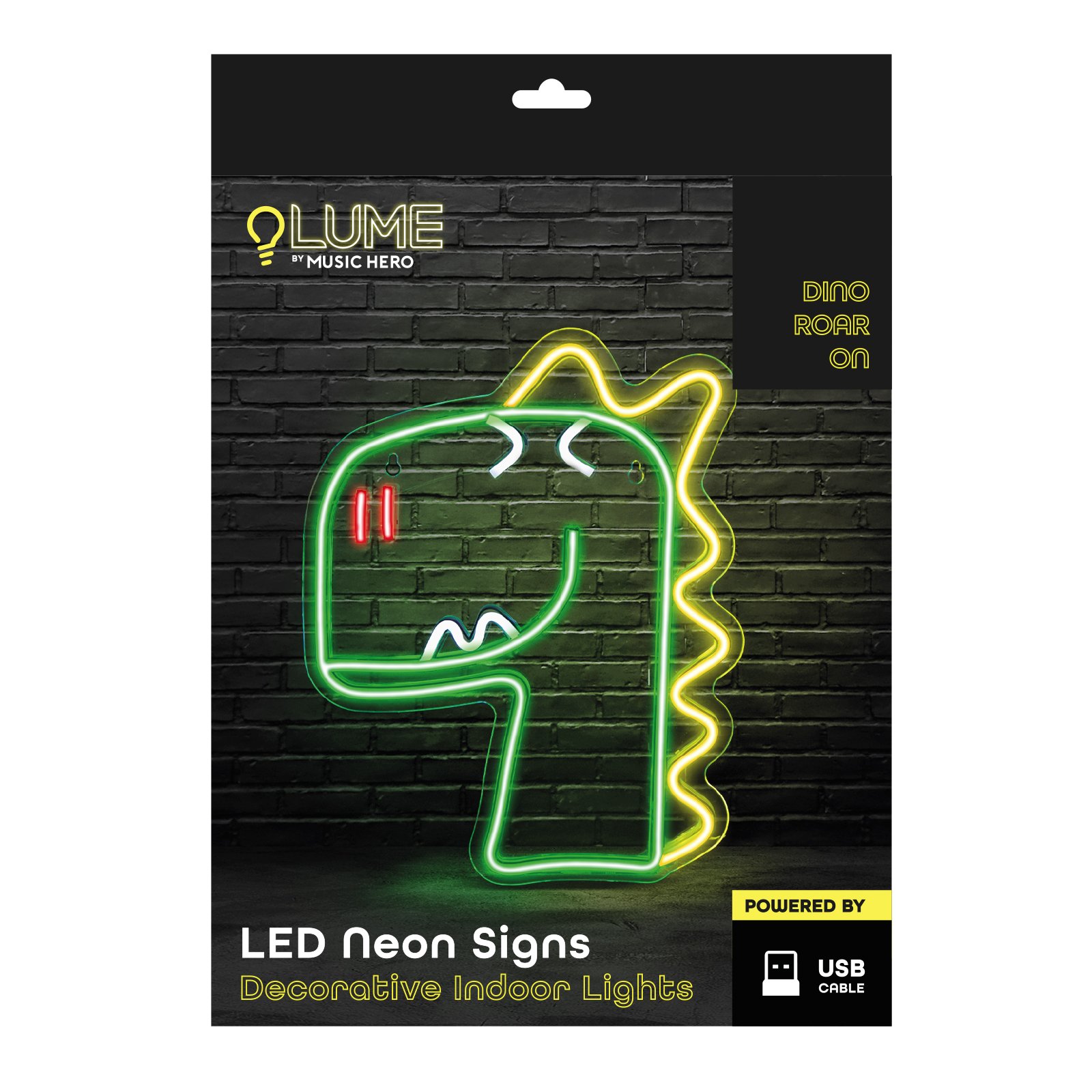 Dinosaur-shaped design Neon effect Dimensions: 26×32.5 cm Low consumption USB Easy to hang