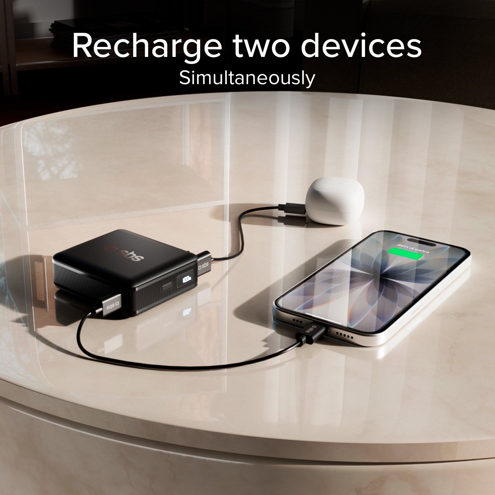 The compact design packs a 10000 mAh high-density battery, which offers high performance in a small package. You can charge two devices at the same time thanks to the USB-C and USB-A ports: no need to choose between your smartphone and wireless headphones, for example.