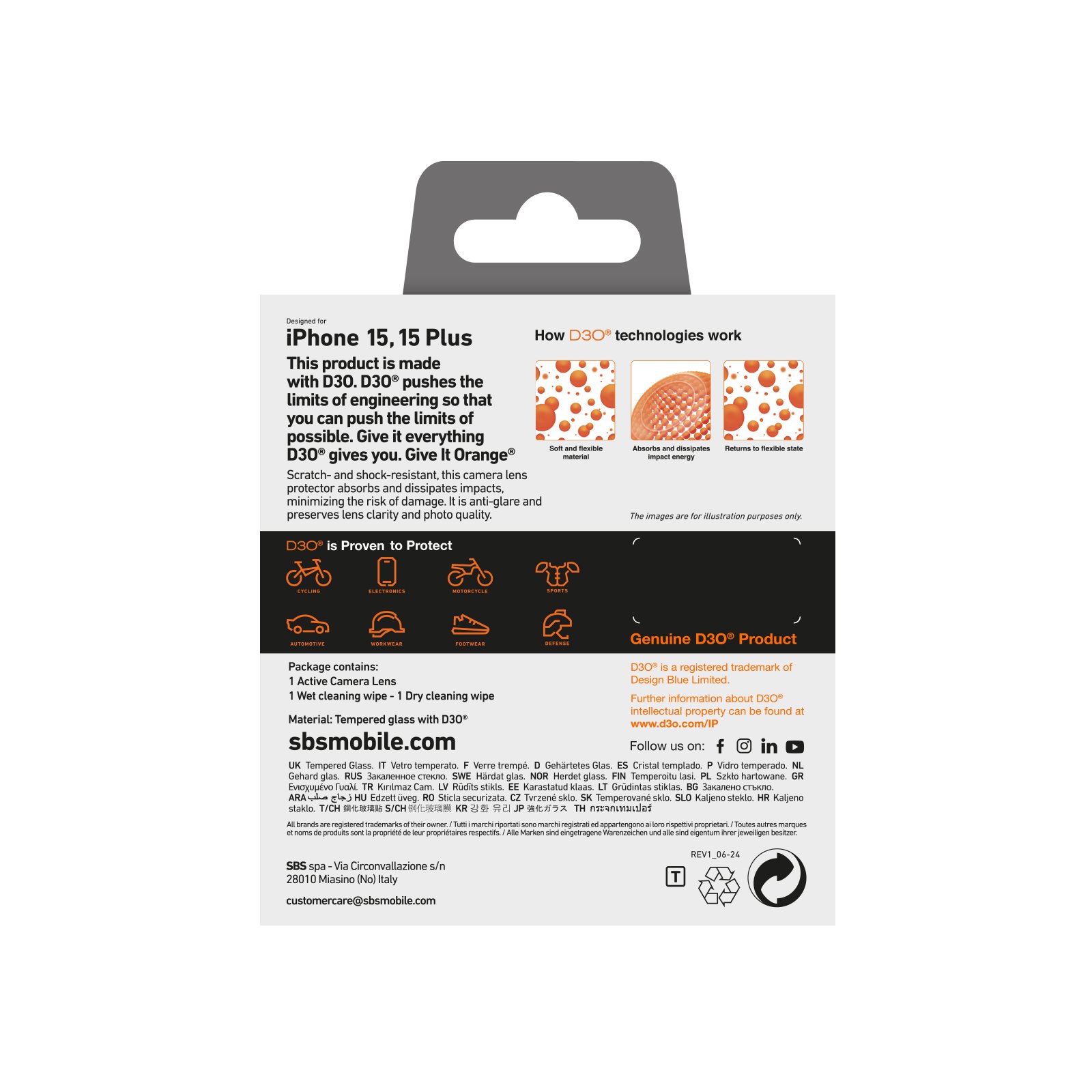 sbs iPhone 15/15 Plus camera glass, with D3O material